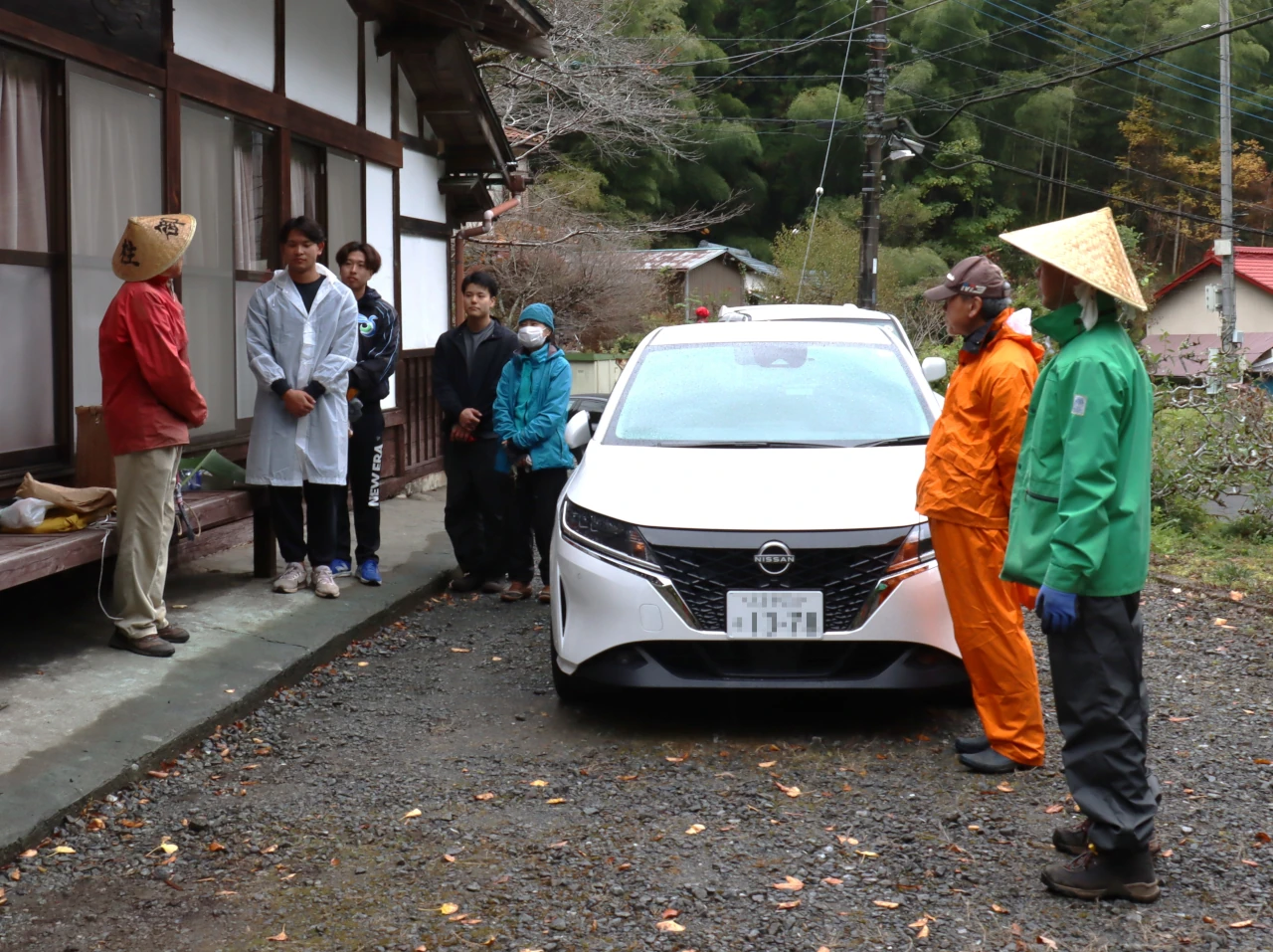 天気予報では、午前中曇りから、午後は雨模様だったので、全員雨具を着用し、自治会館に於いて簡単なミーティングを行い出発。