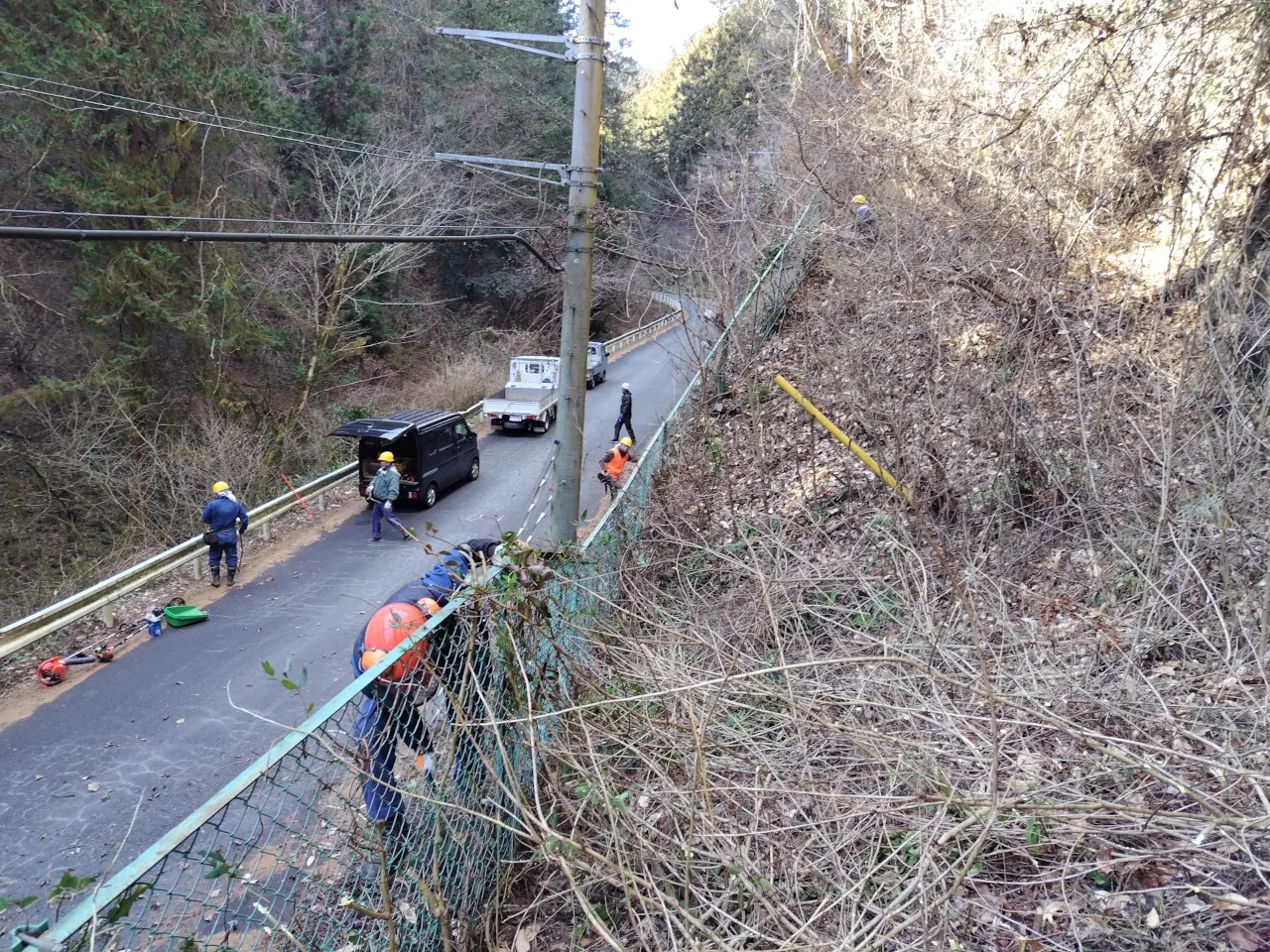 擁壁のフェンス際も安全を確保しながら灌木を伐採
