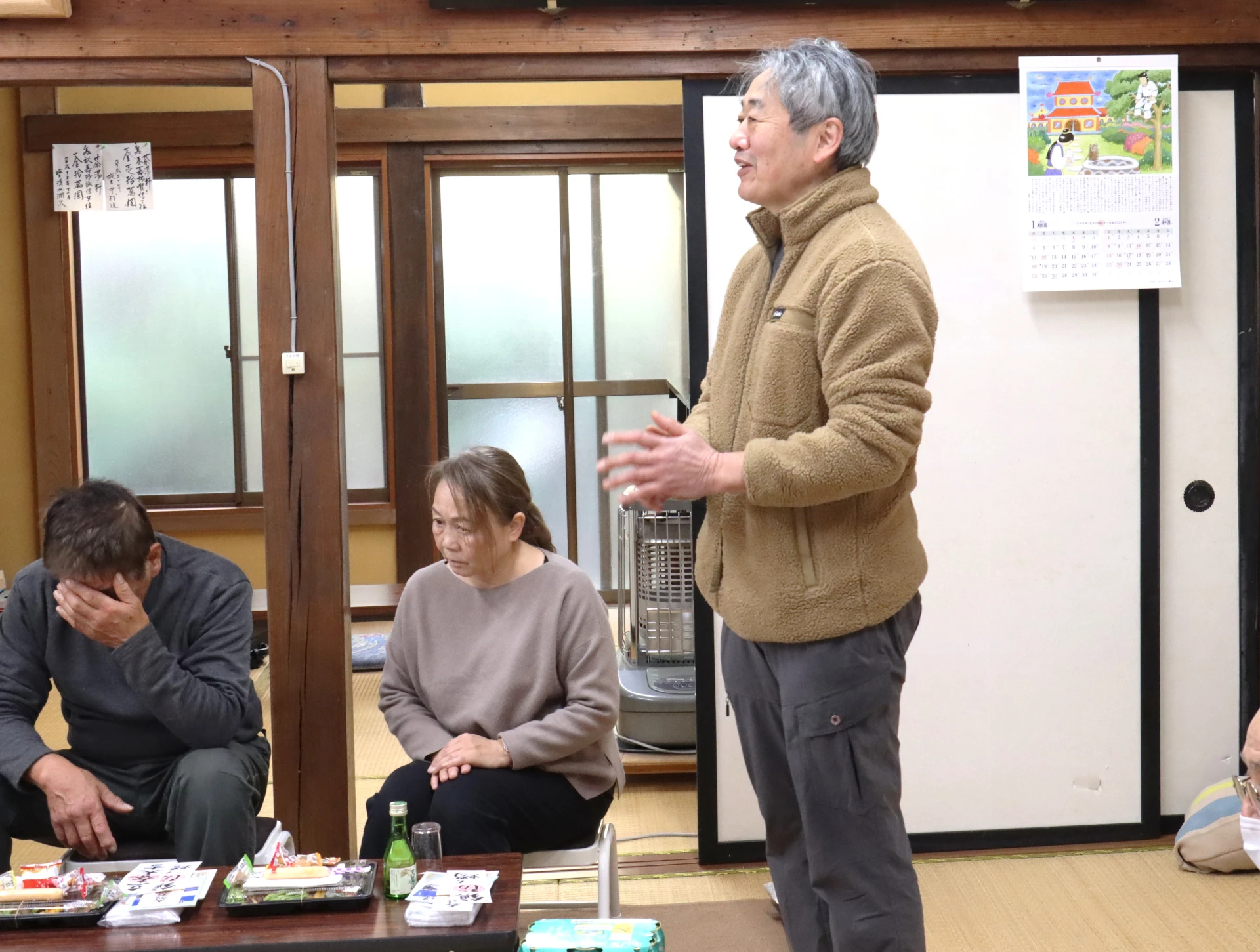 懇親会は、阿須のレストラン「ホットポット」店長の清水修さんの司会進行で行われ、市川章弘氏子総代長、竹本宮司、鈴木方丈と上分自治会長の木崎明弘さんに挨拶を頂き、中村貢滋氏子総代の発声で「乾杯」を行い、出された「おり弁当」とお酒を頂き、楽しく新年の宴会を行いました。